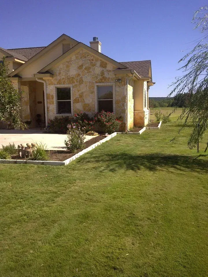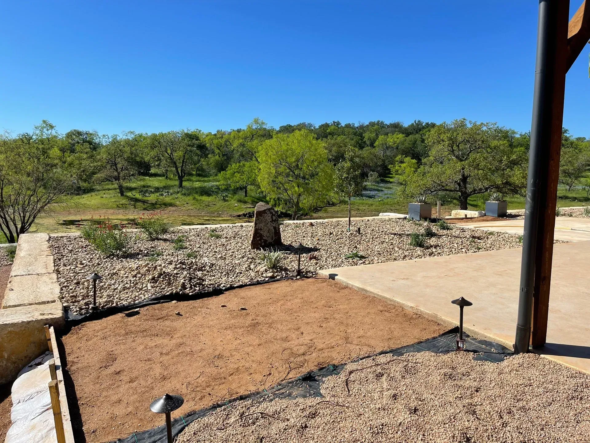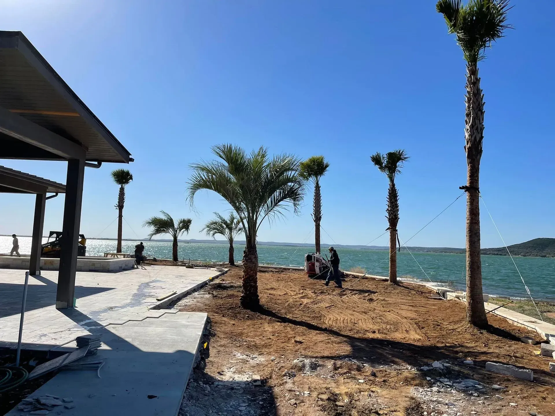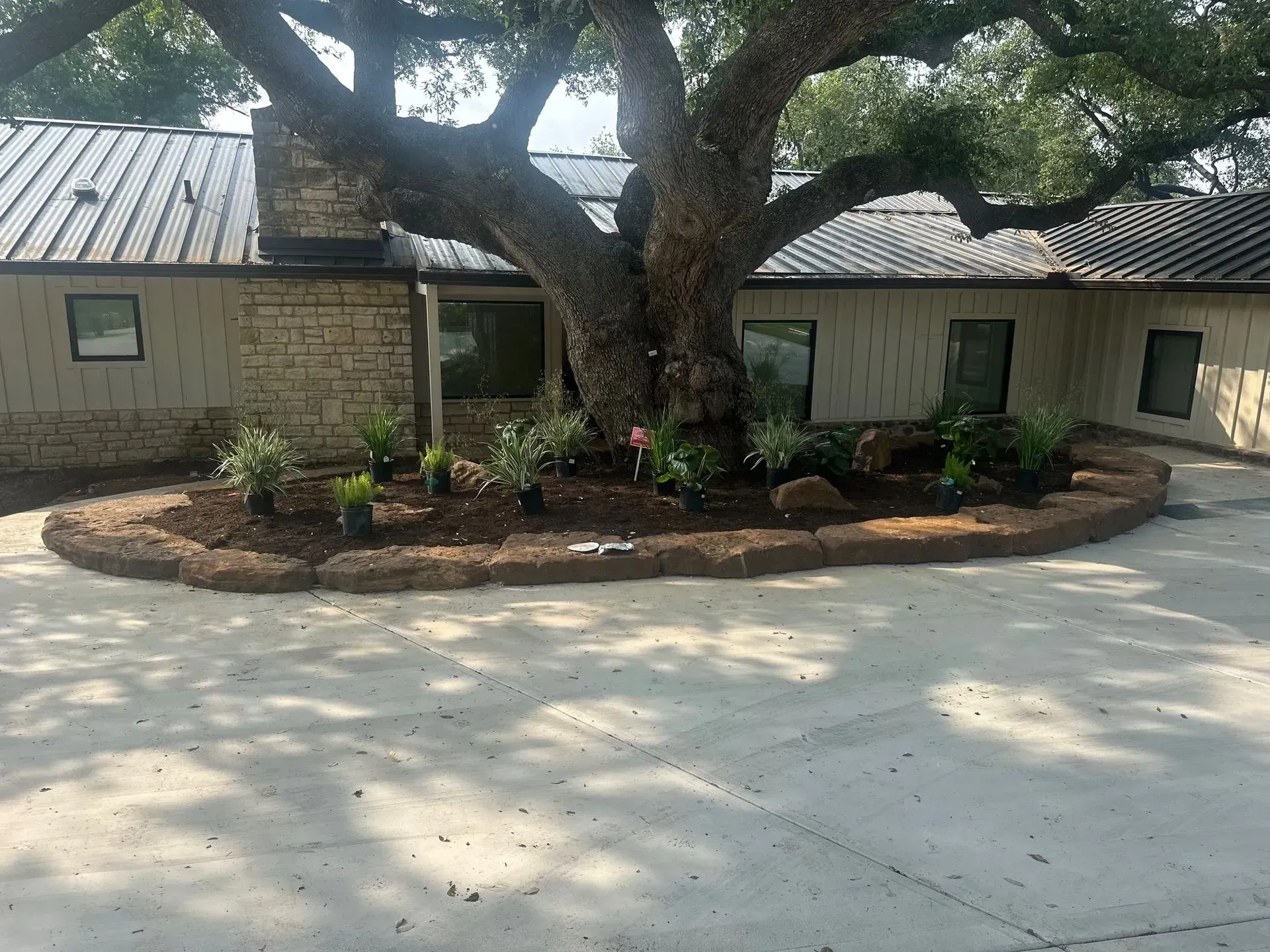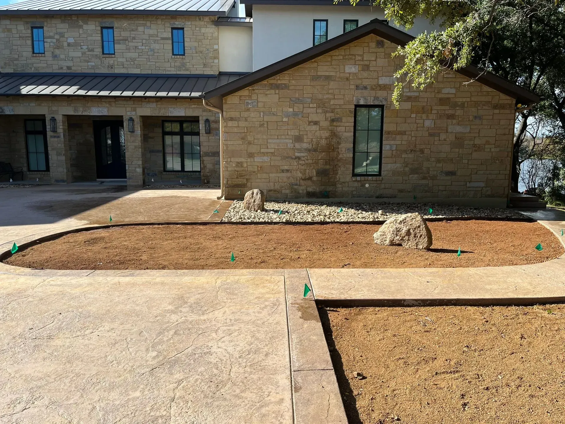 Black and white icon of a house, two trees, and a cliff-like structure, with a wavy line at the bottom.