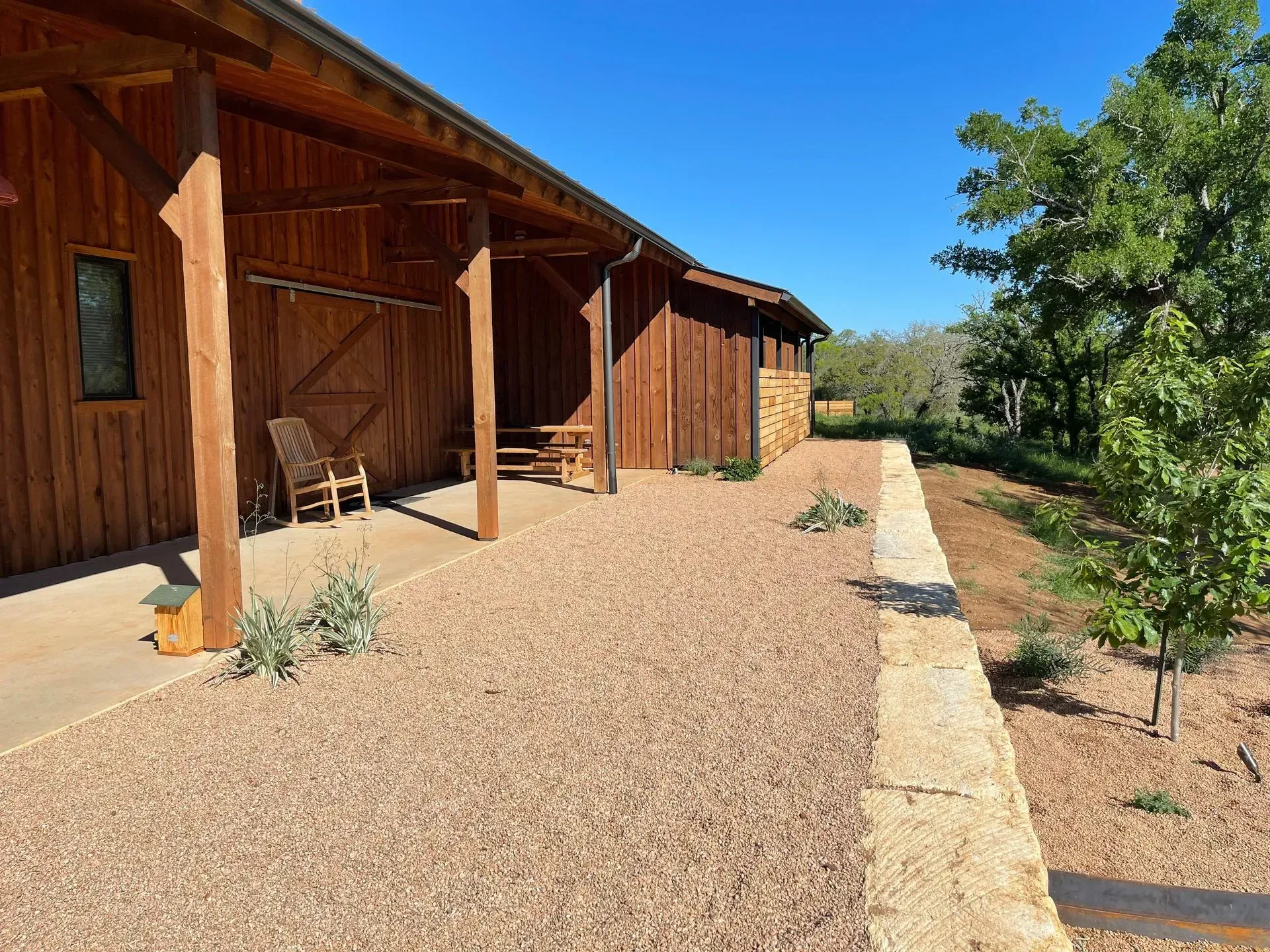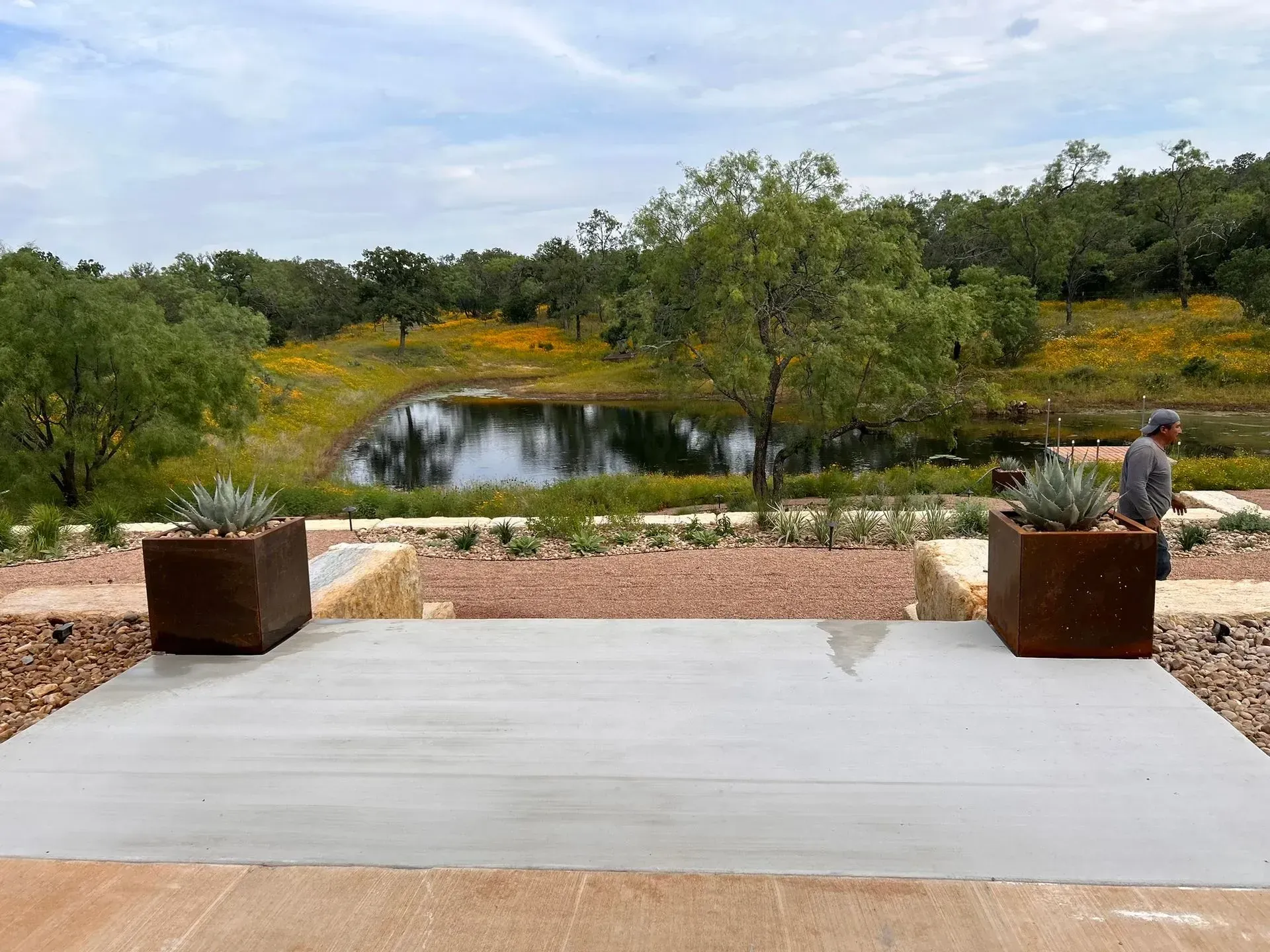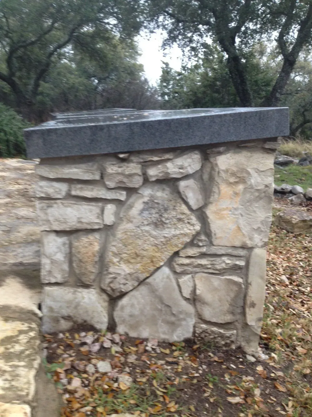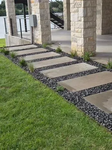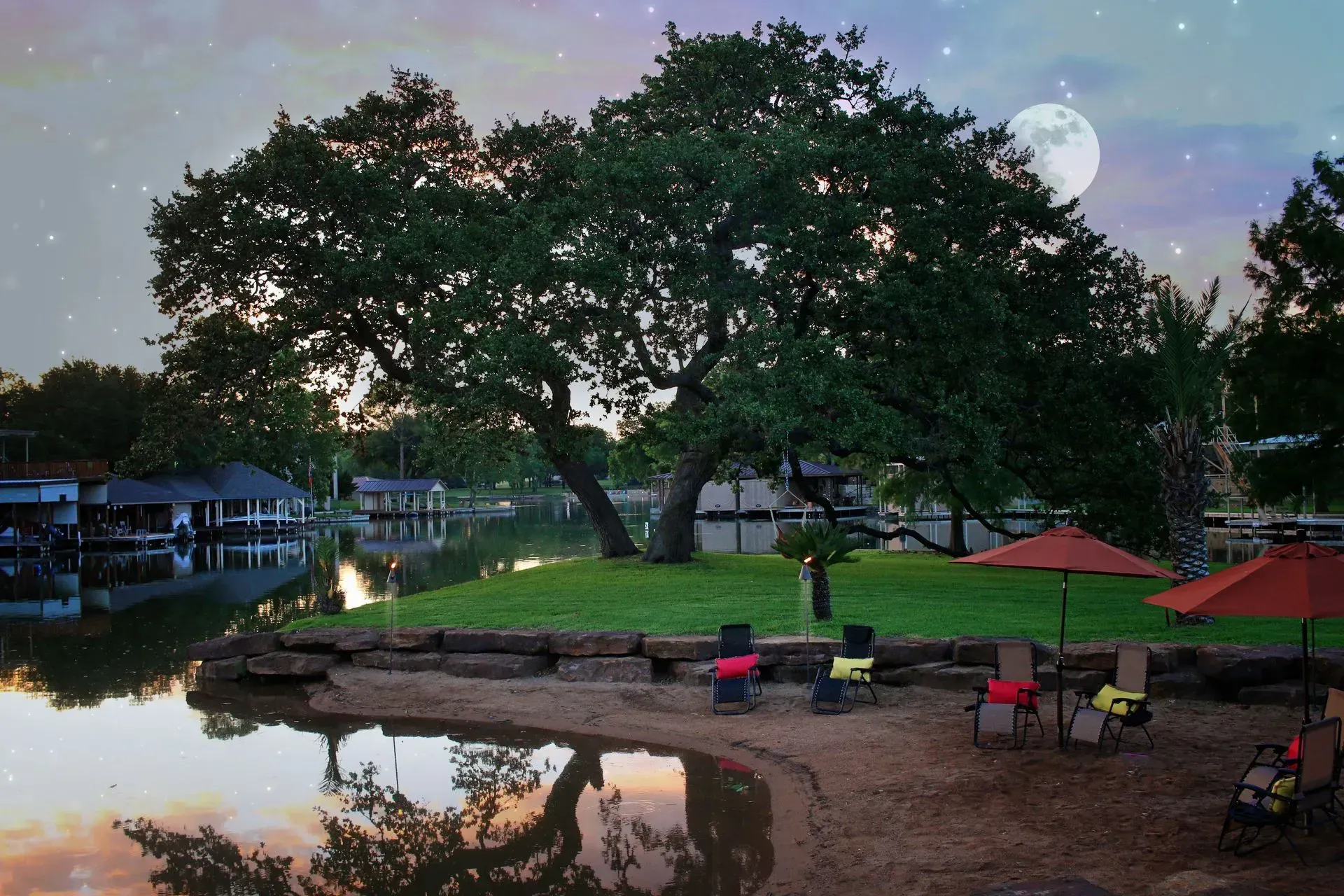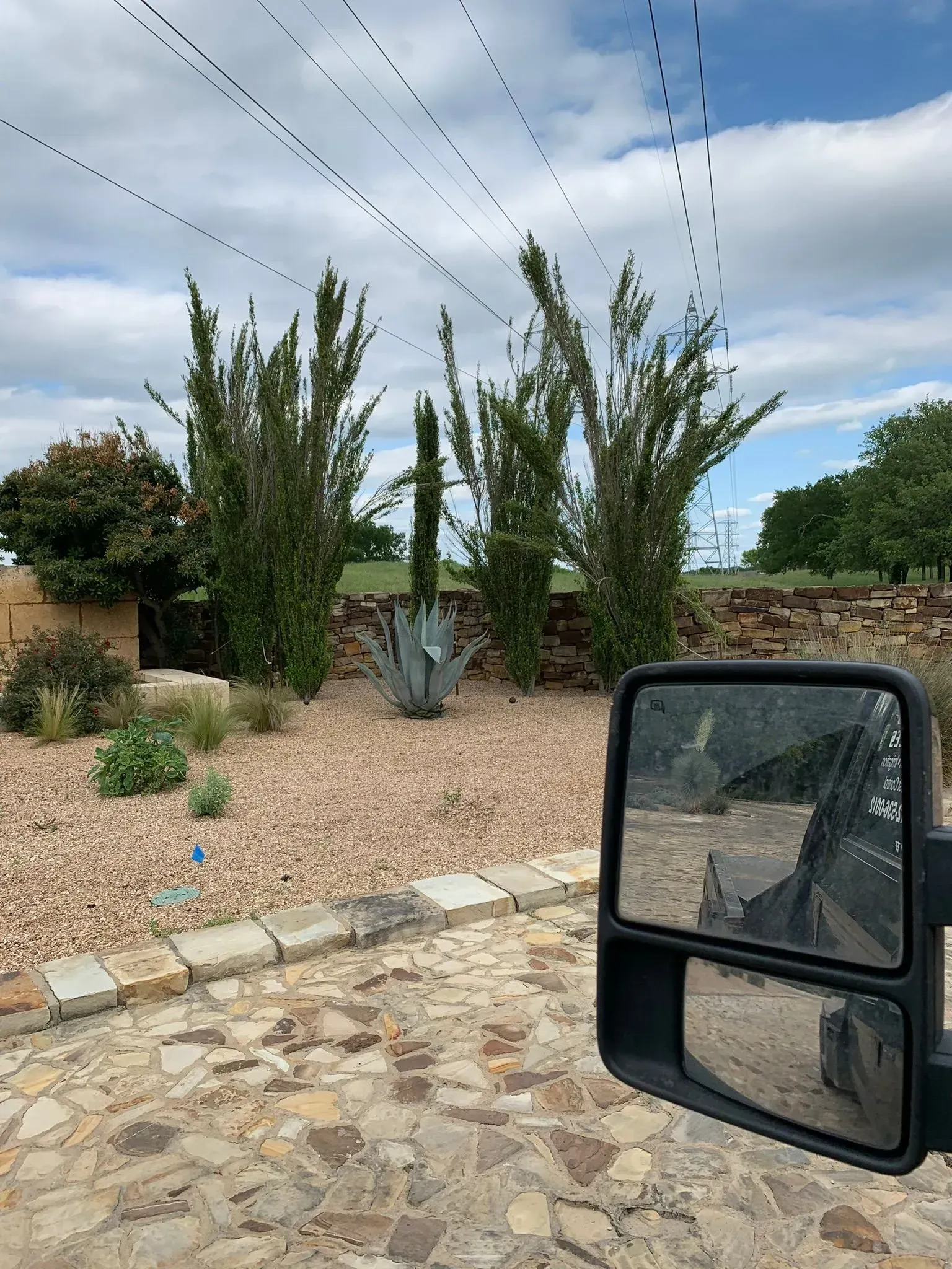 Black and white icon of a house, two trees, and a cliff-like structure, with a wavy line at the bottom.