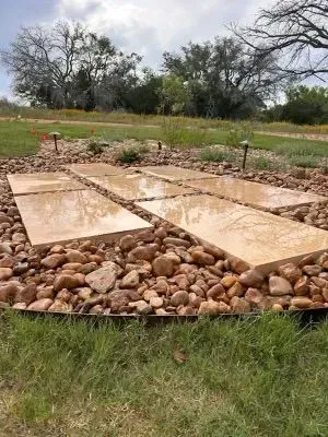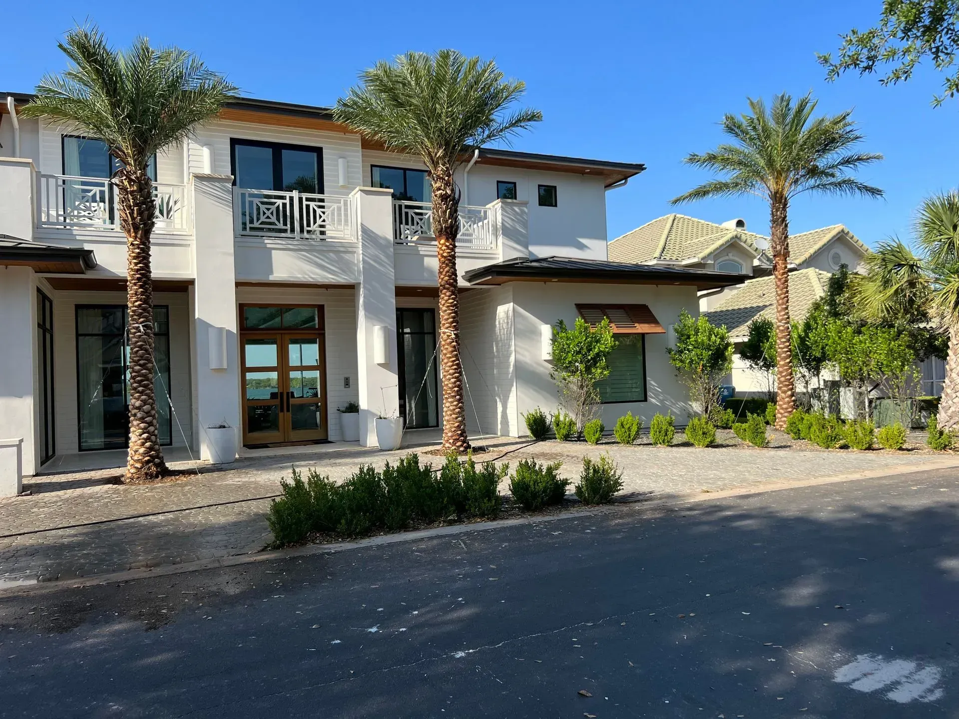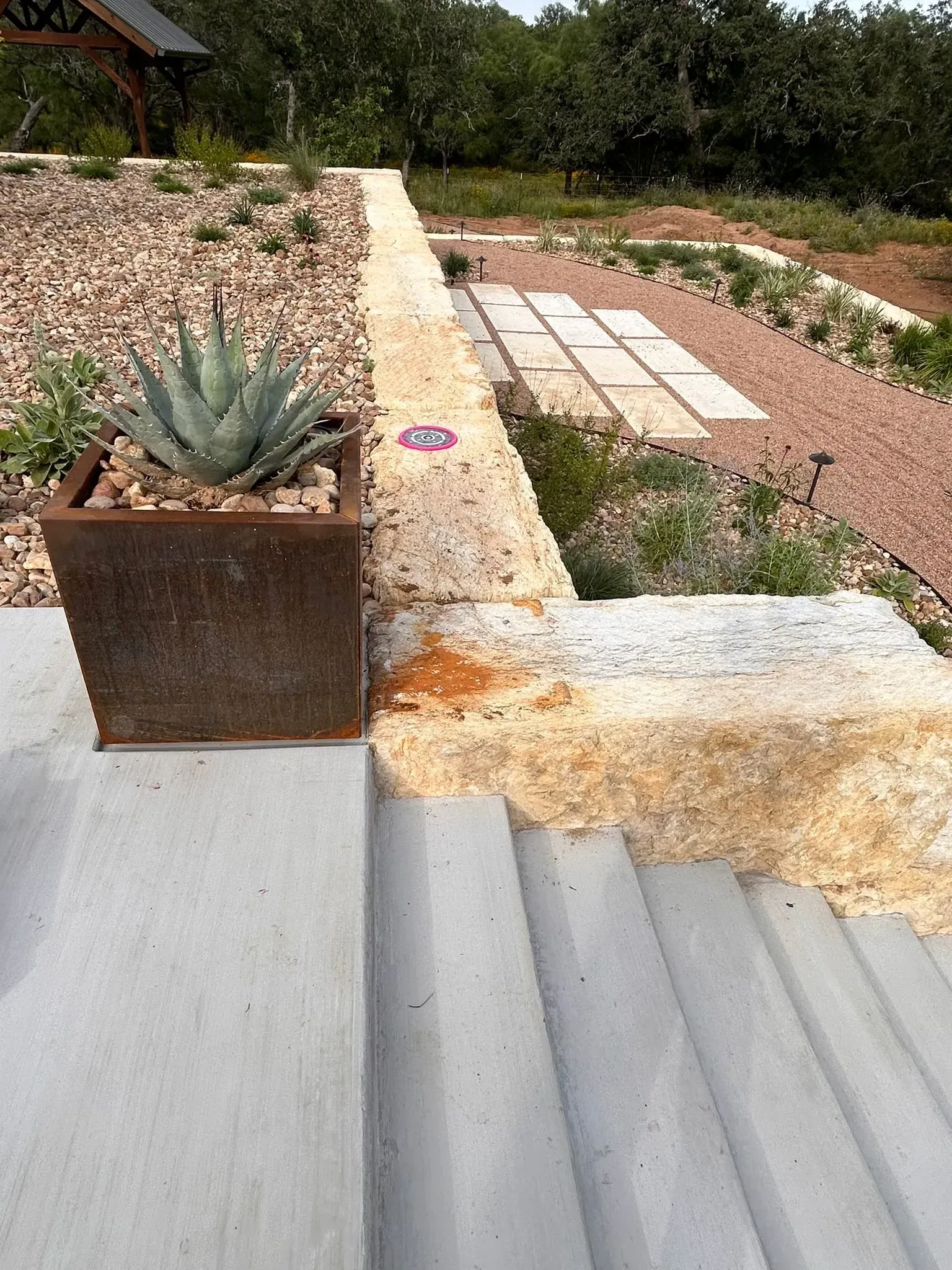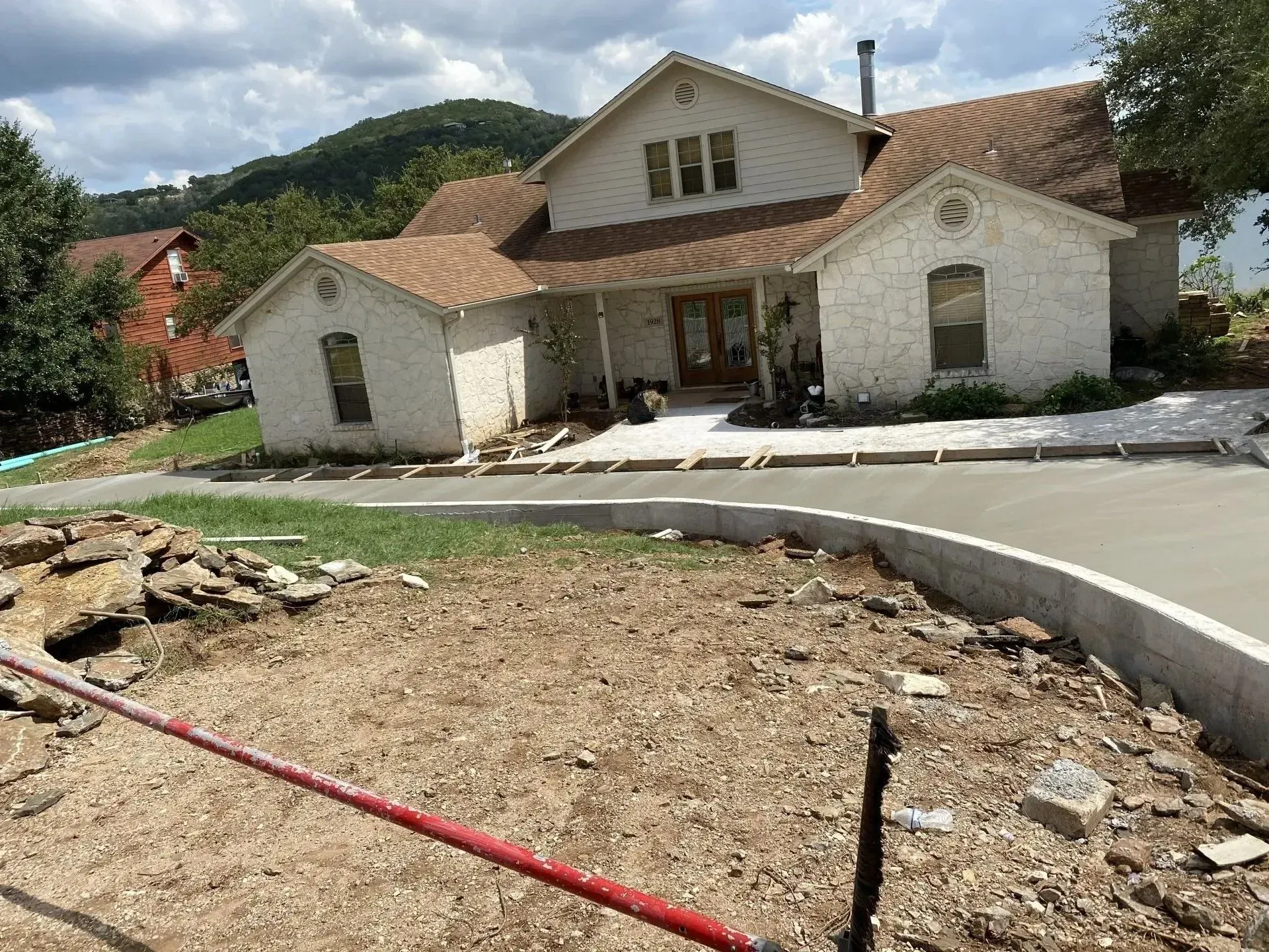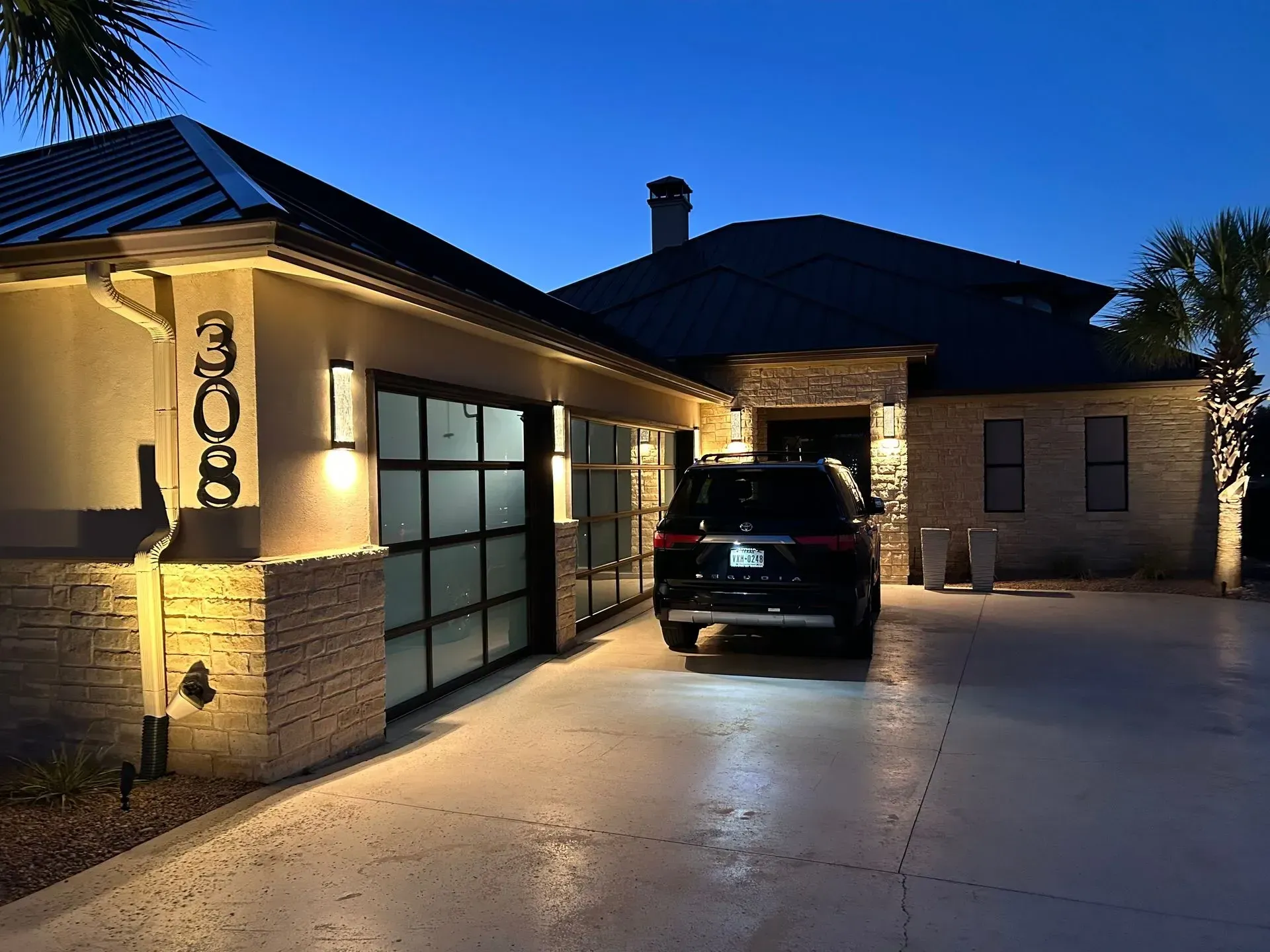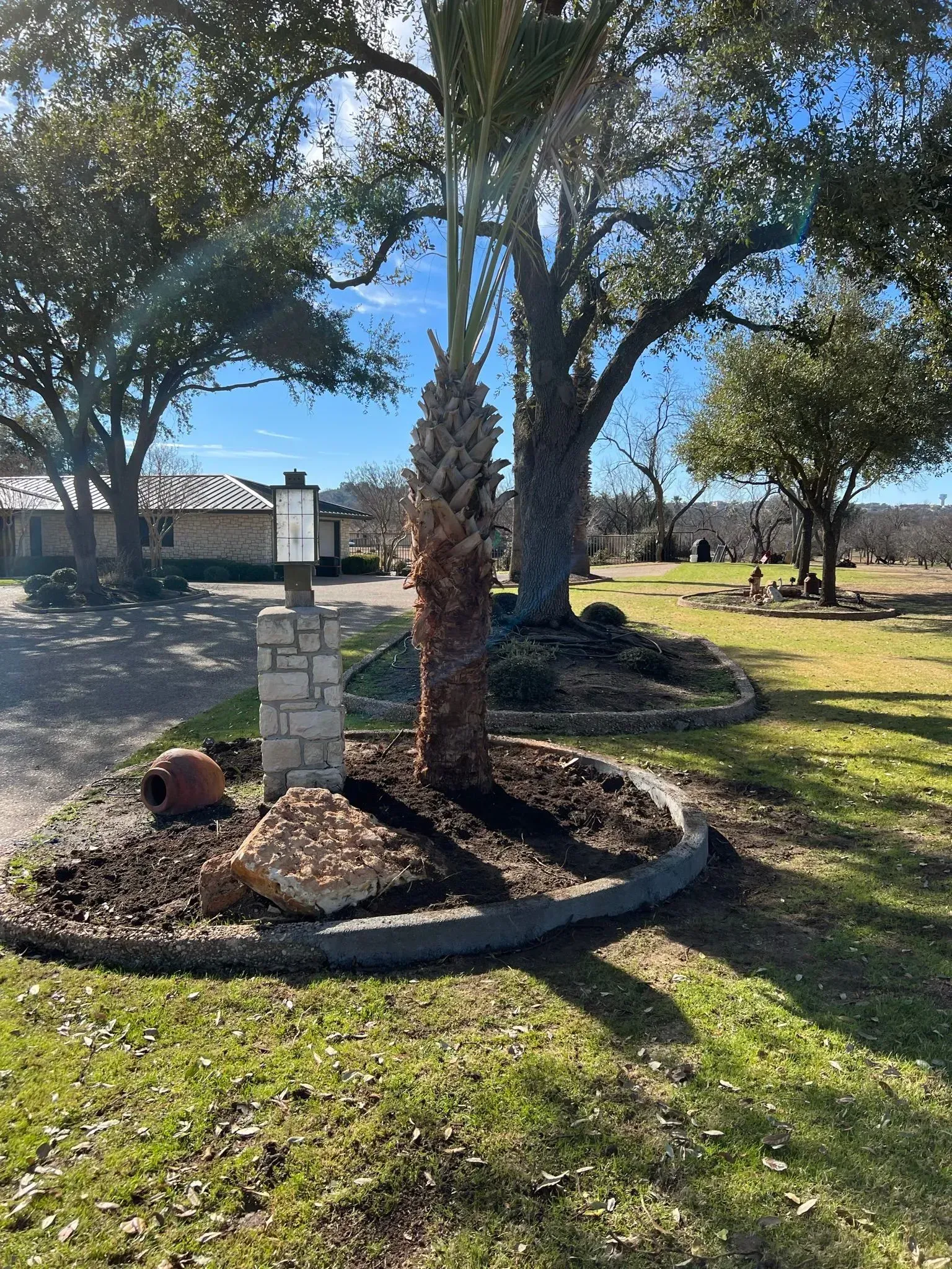 Black and white icon of a house, two trees, and a cliff-like structure, with a wavy line at the bottom.