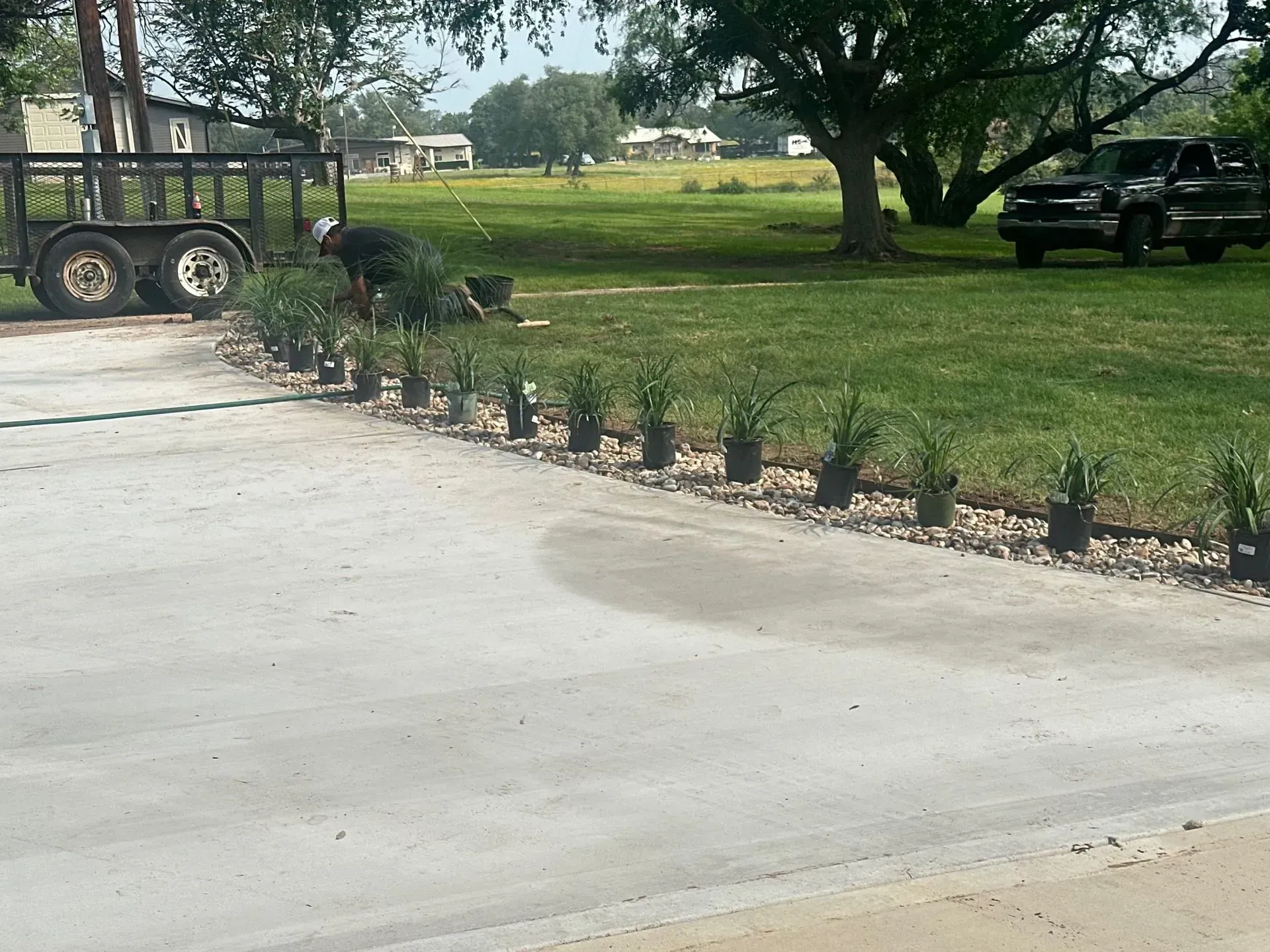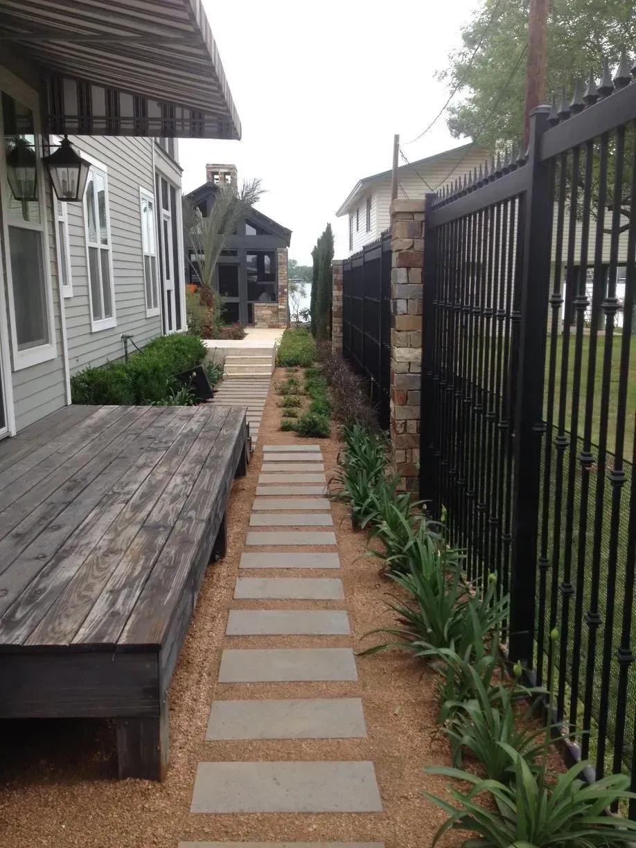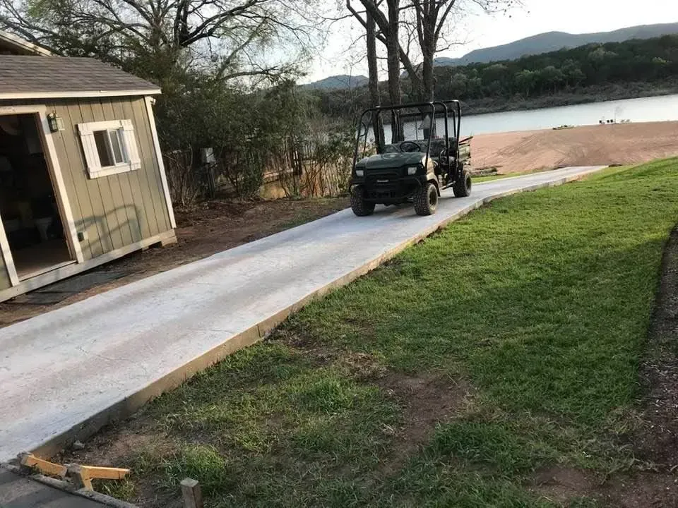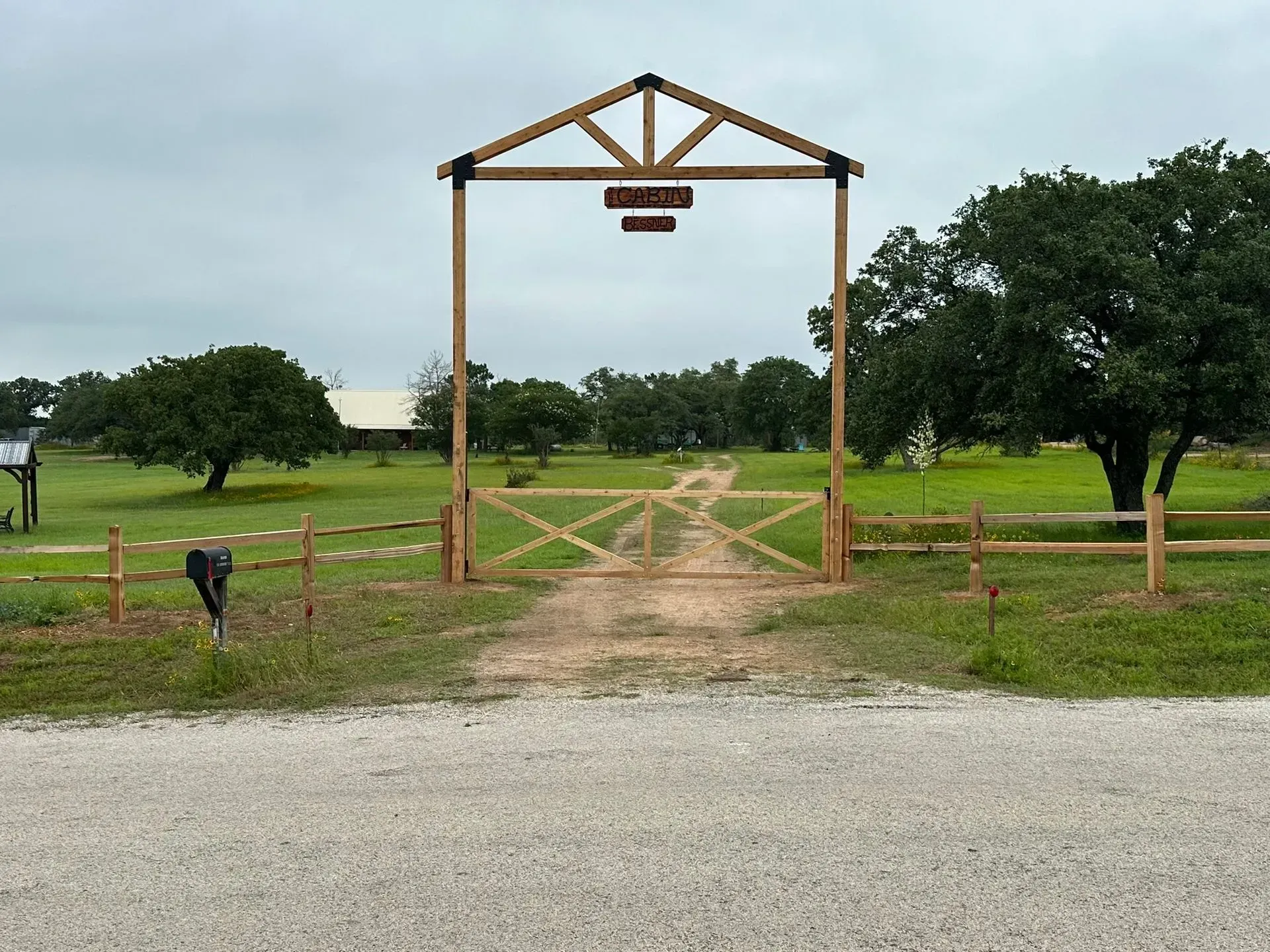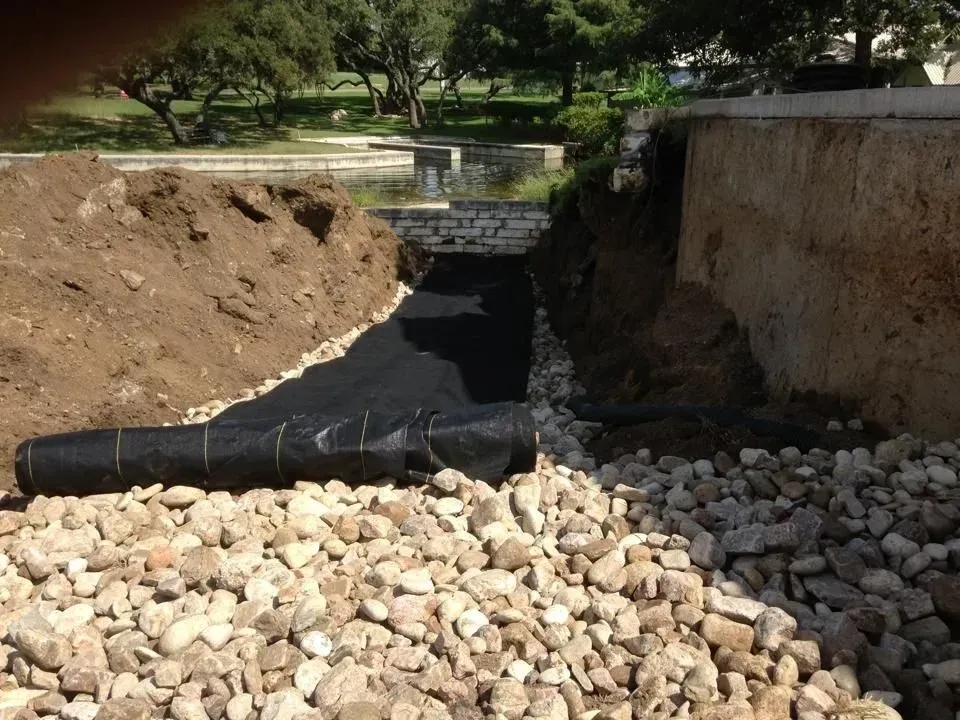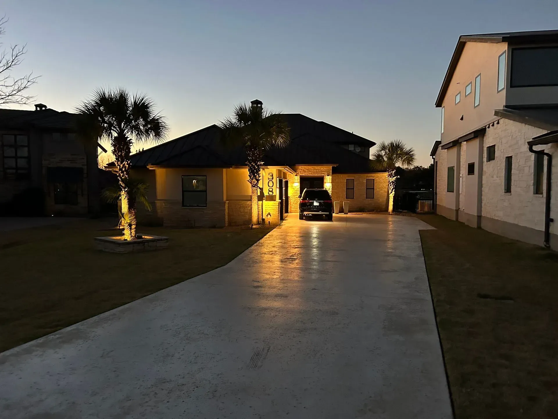 Black and white icon of a house, two trees, and a cliff-like structure, with a wavy line at the bottom.