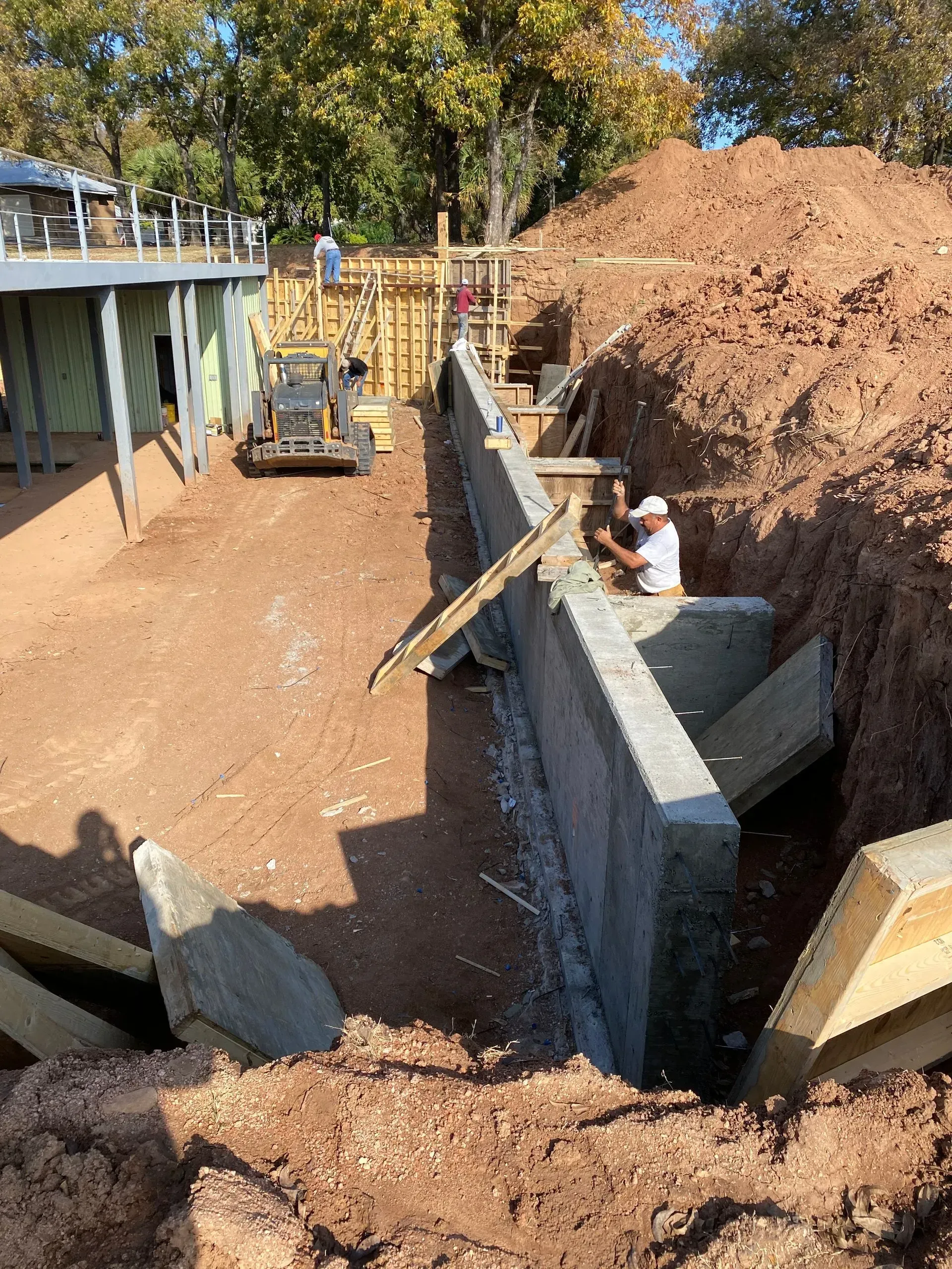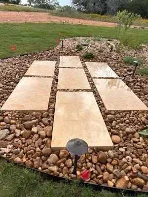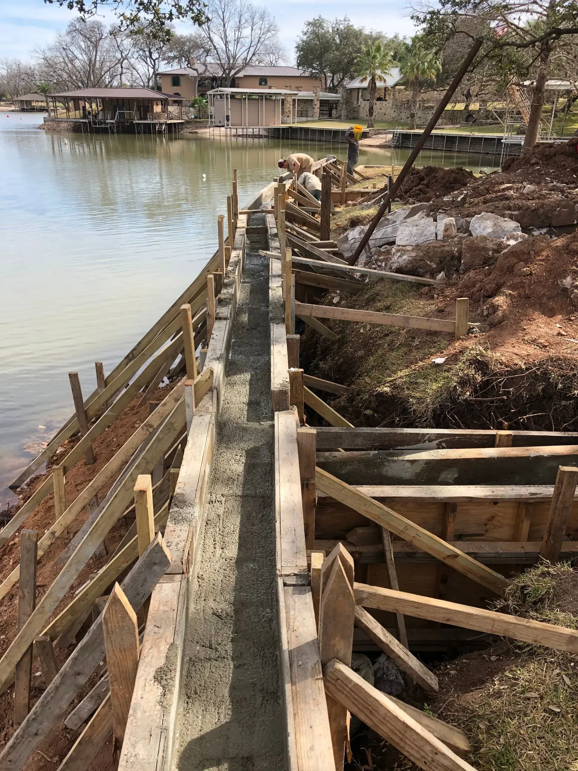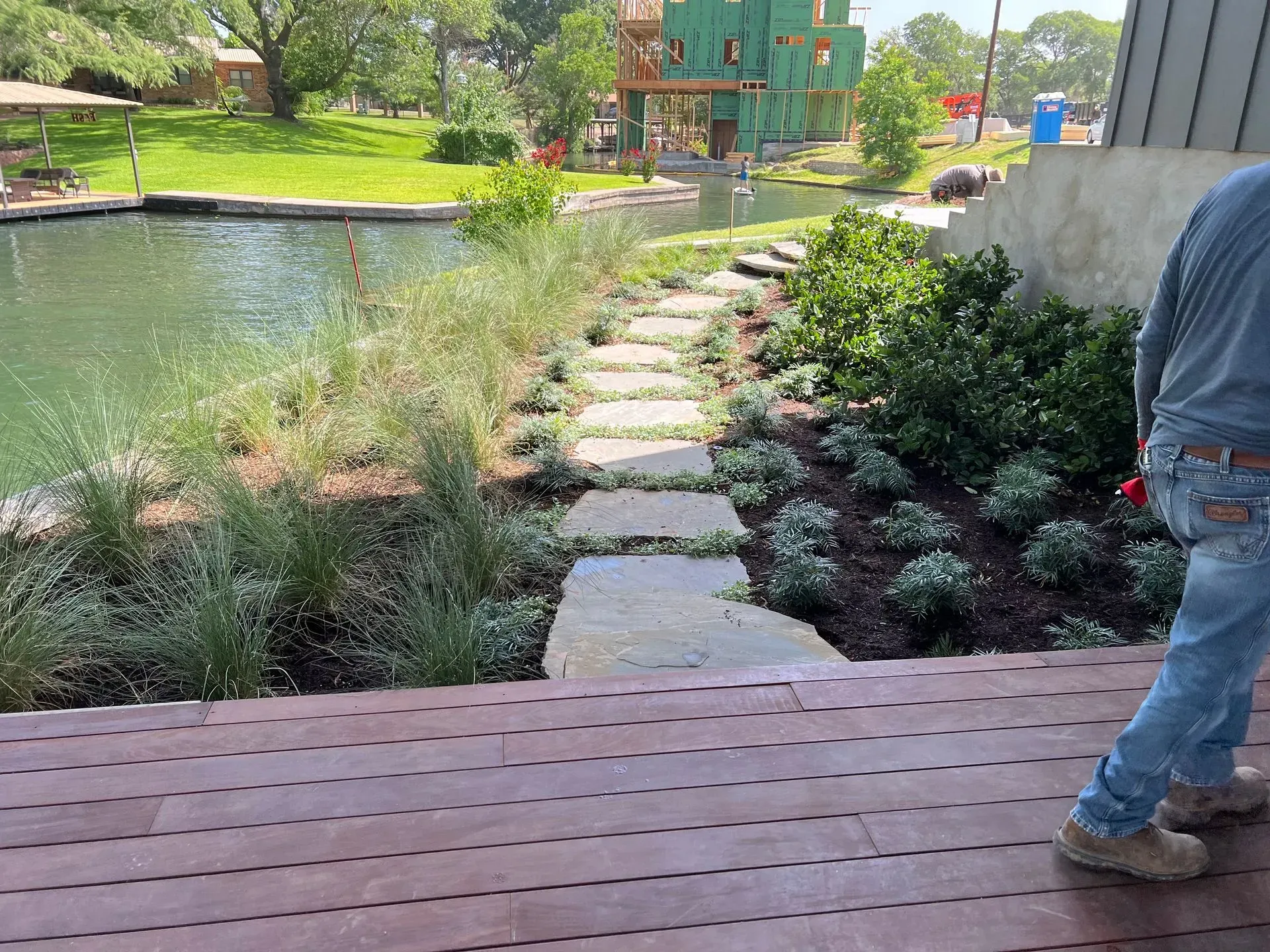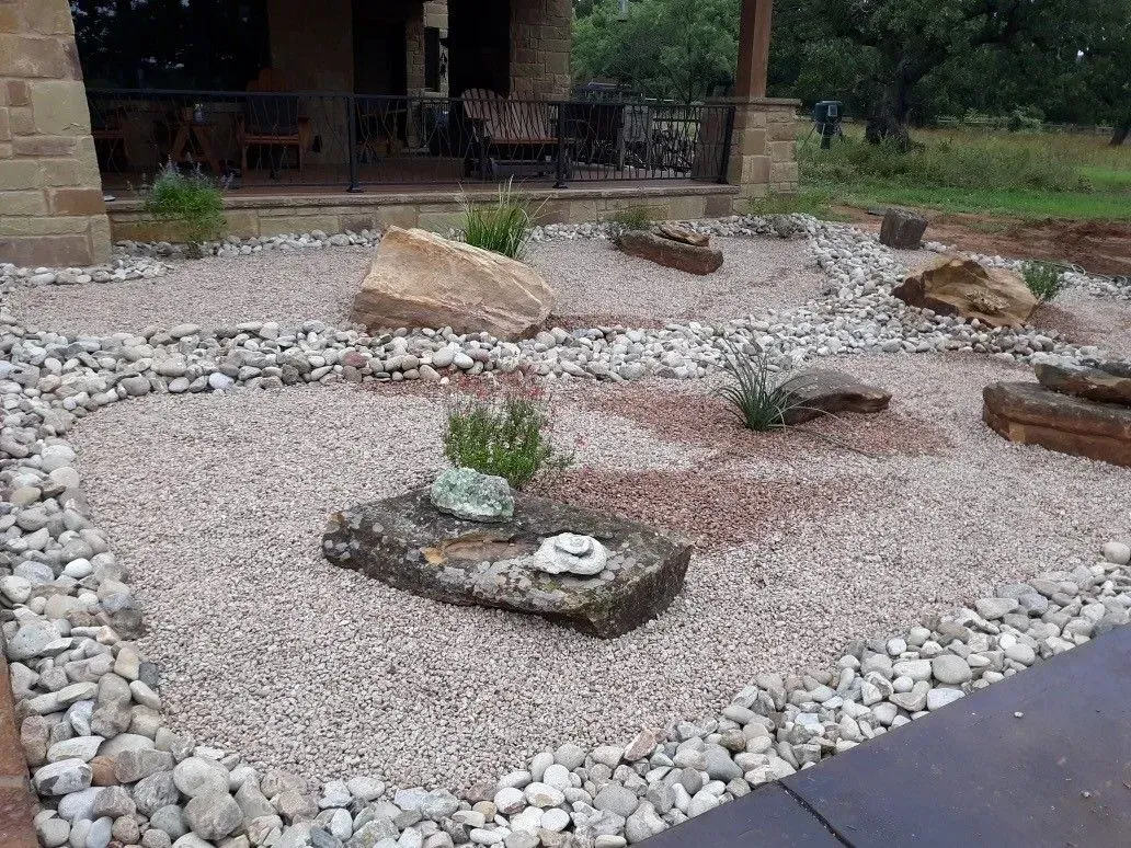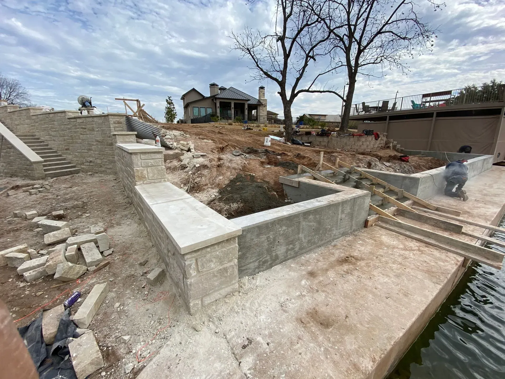 Black and white icon of a house, two trees, and a cliff-like structure, with a wavy line at the bottom.