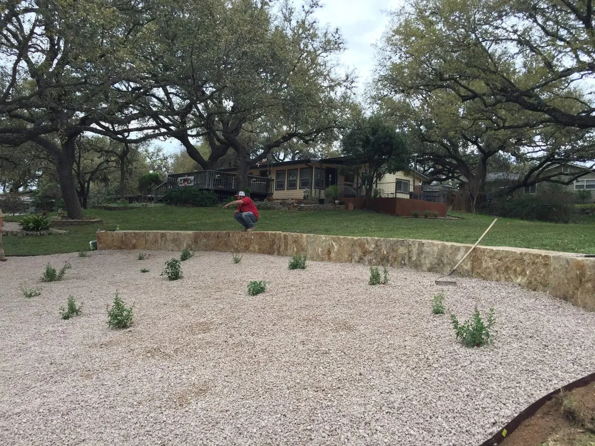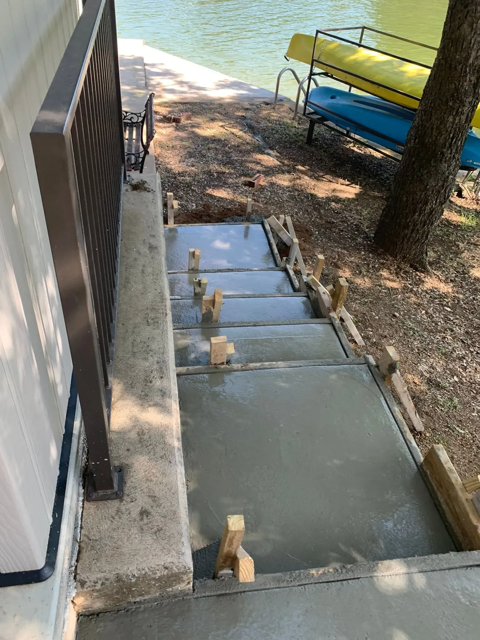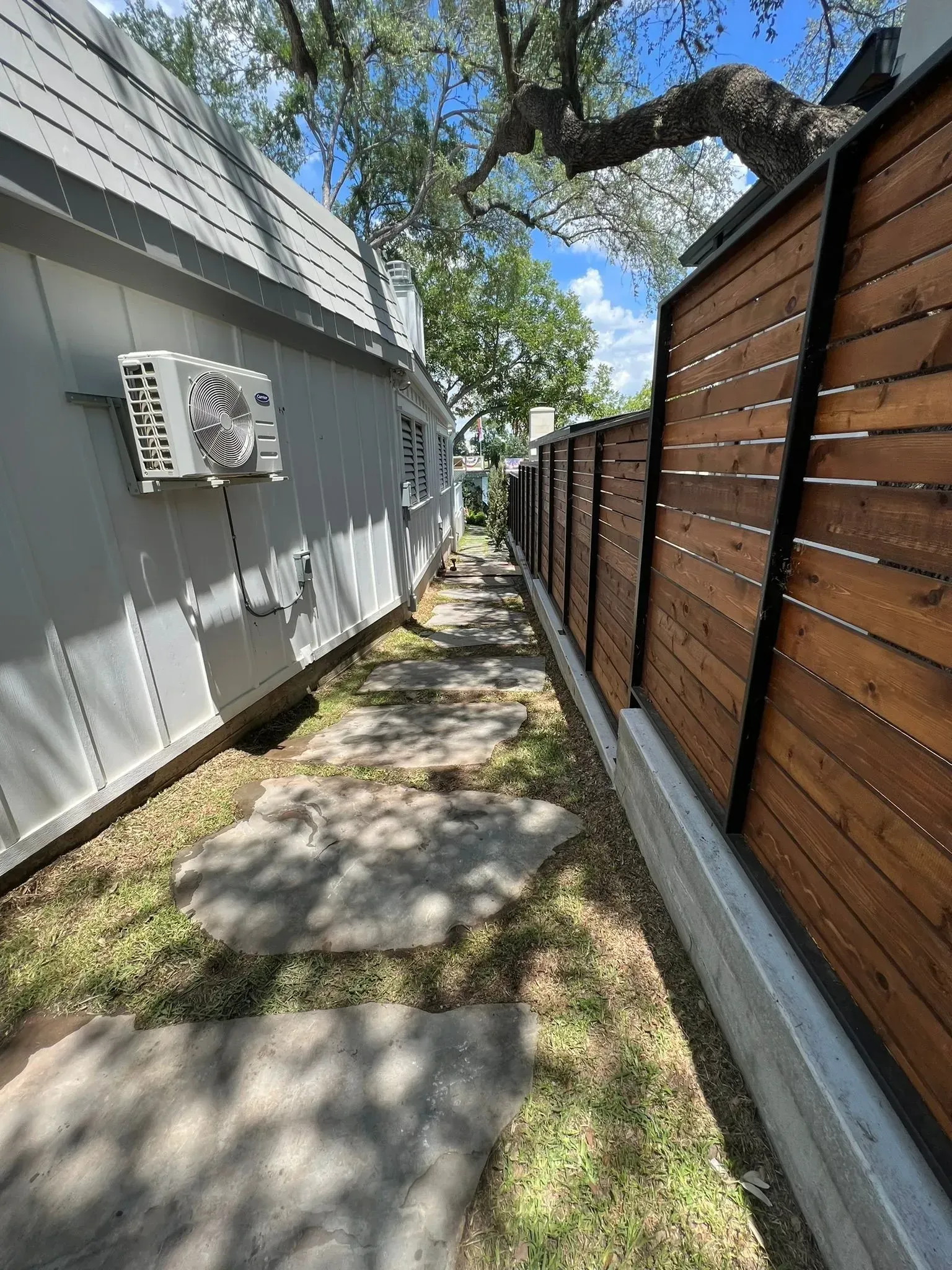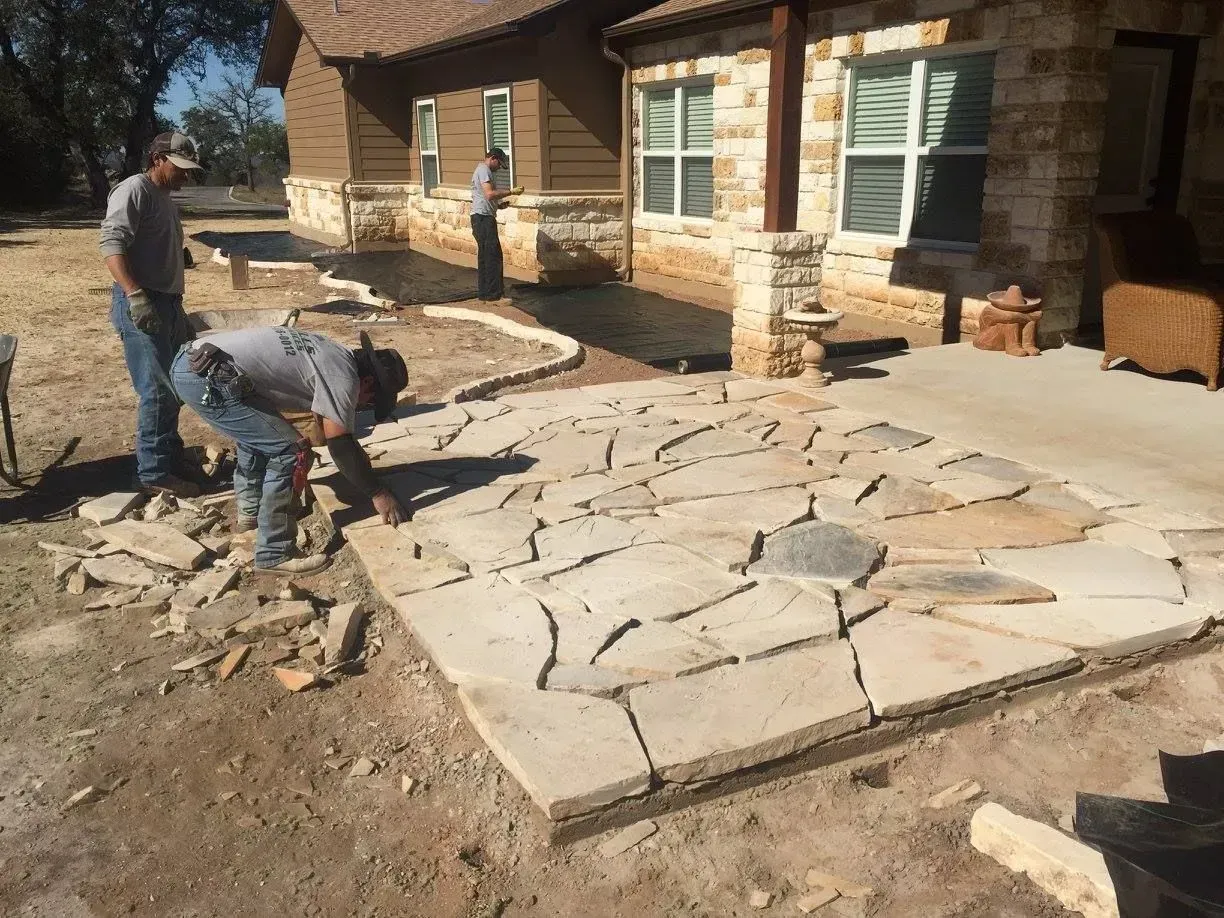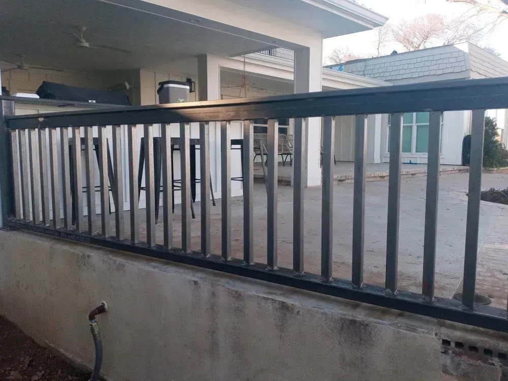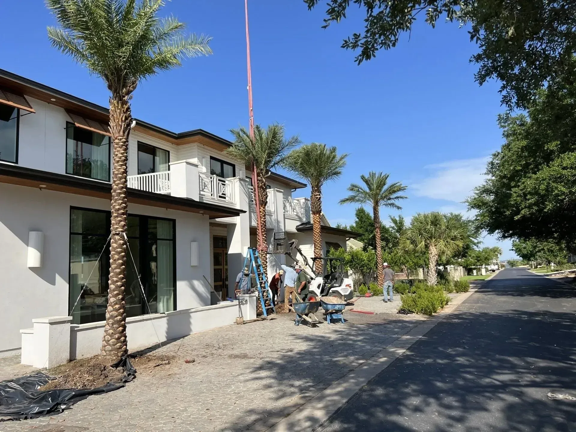 Black and white icon of a house, two trees, and a cliff-like structure, with a wavy line at the bottom.