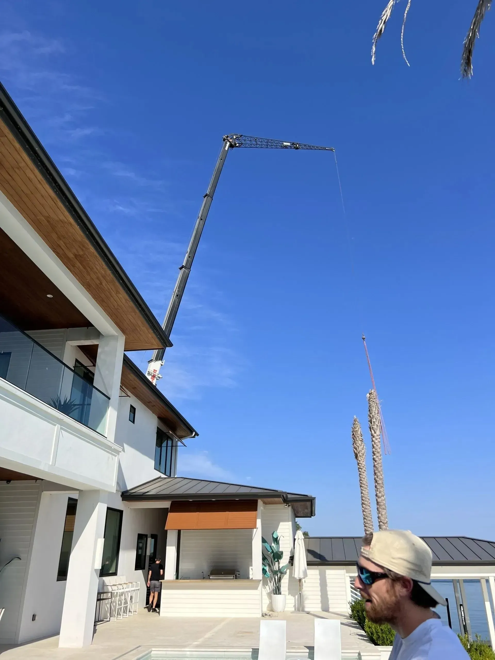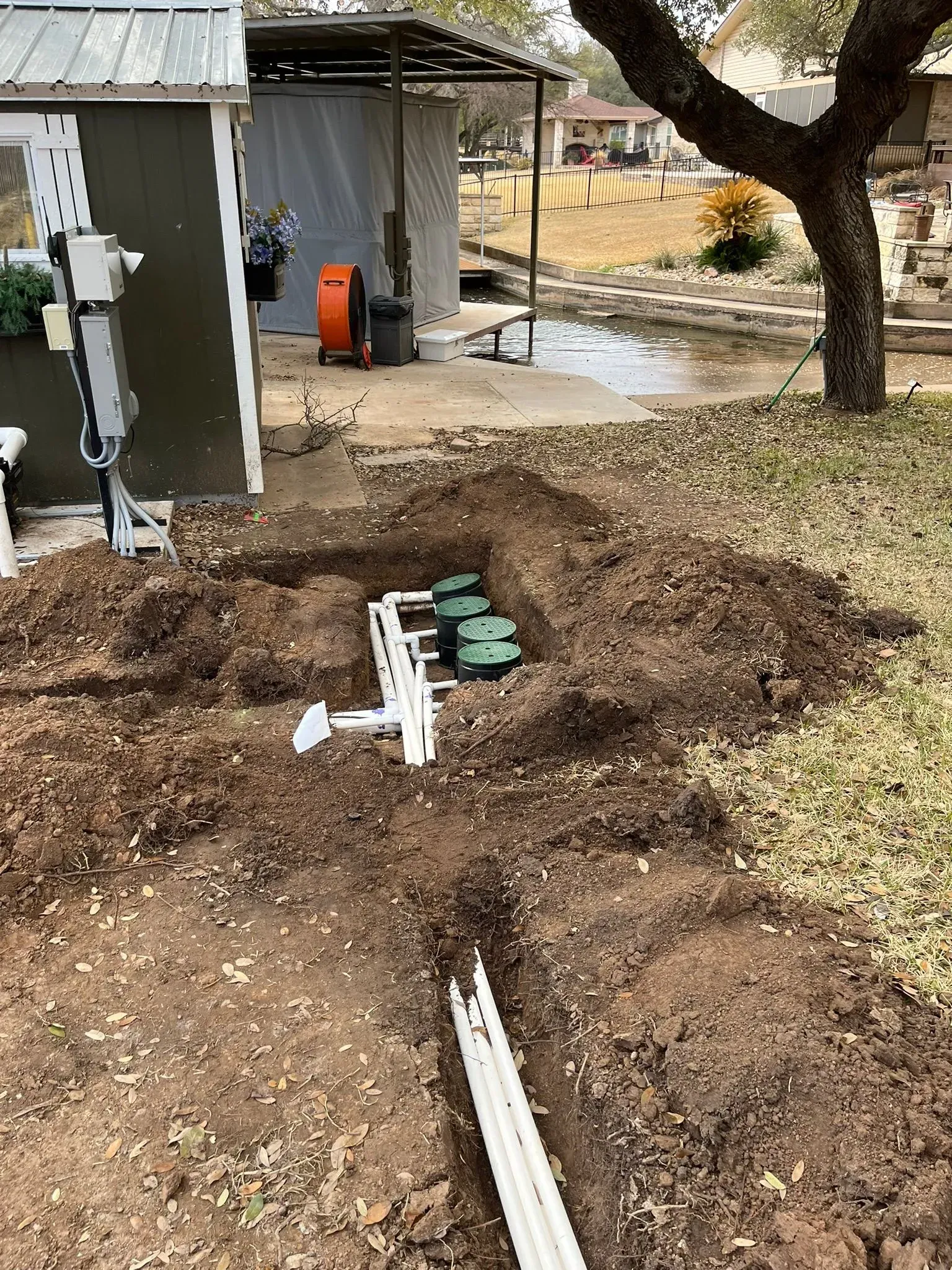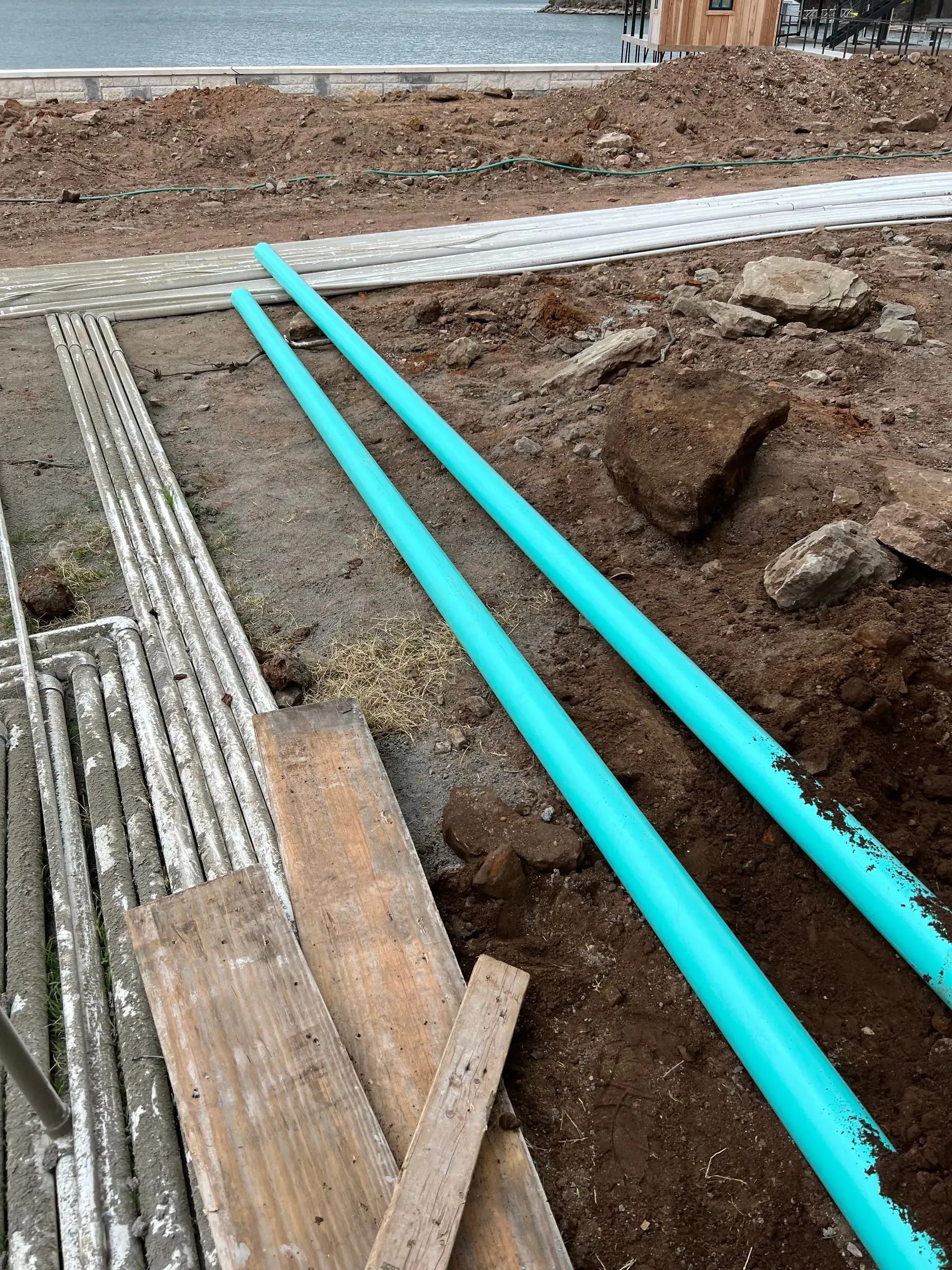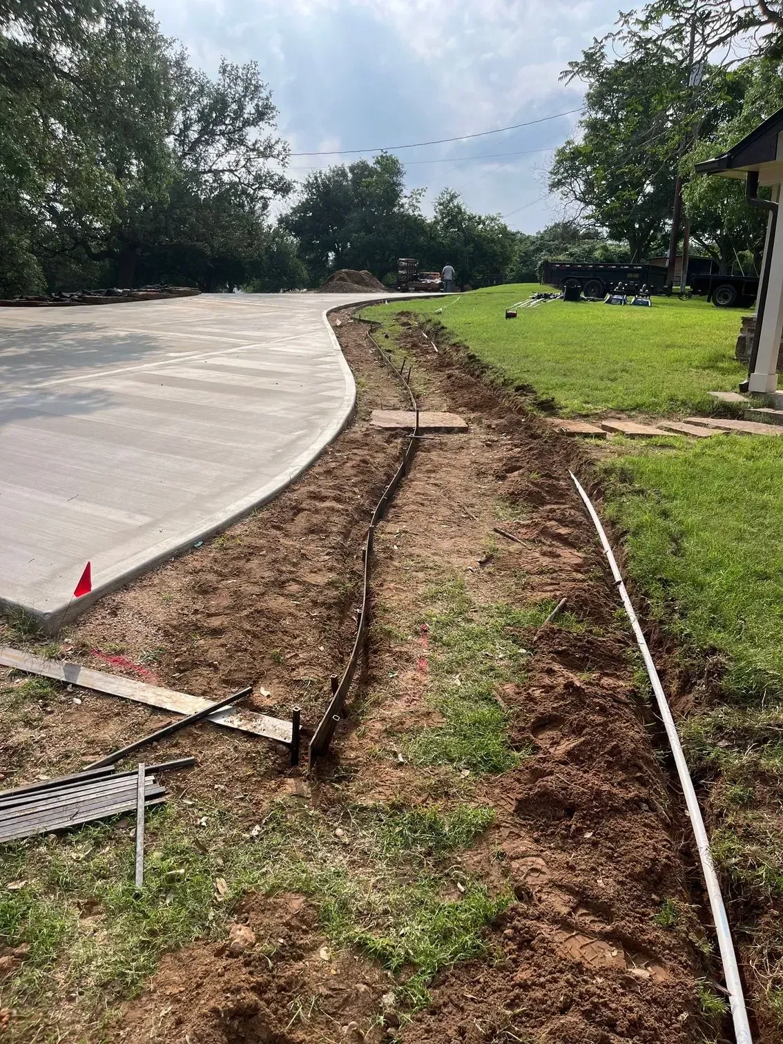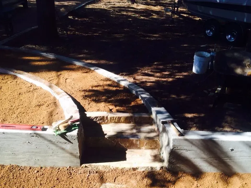Black and white icon of a house, two trees, and a cliff-like structure, with a wavy line at the bottom.
